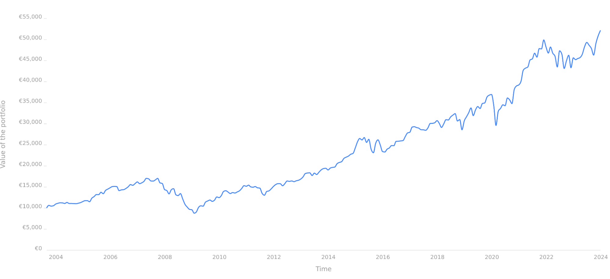 FTSE All-World, investendo 10.000 € nel 2004 fino a marzo 2024 (fonte: curvo.eu/backtest)